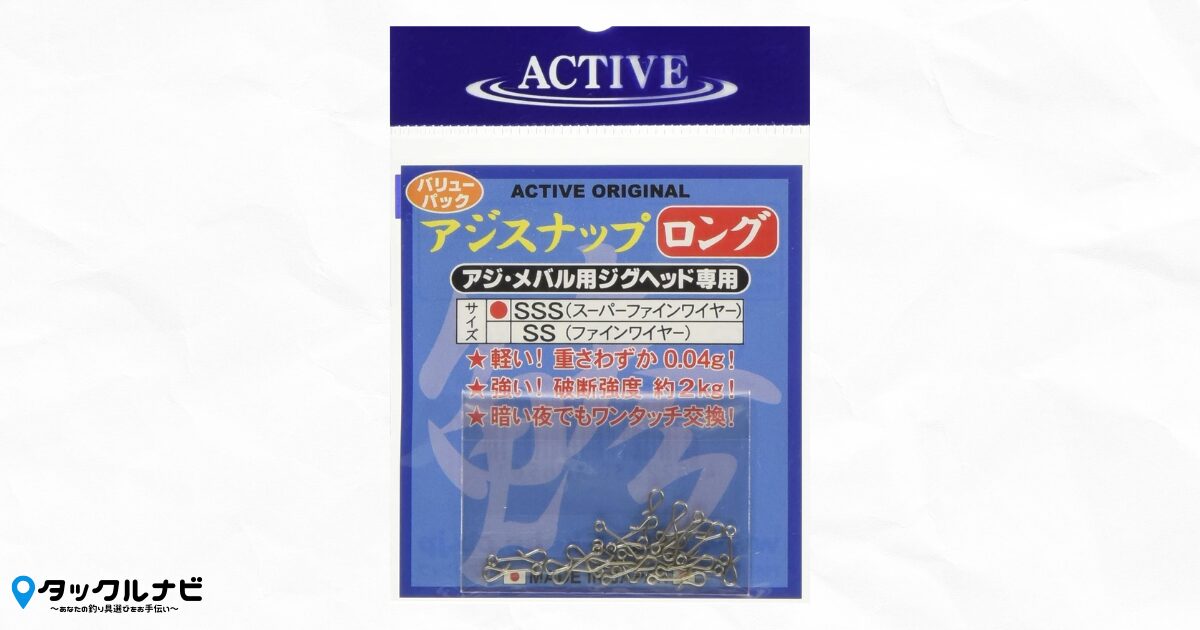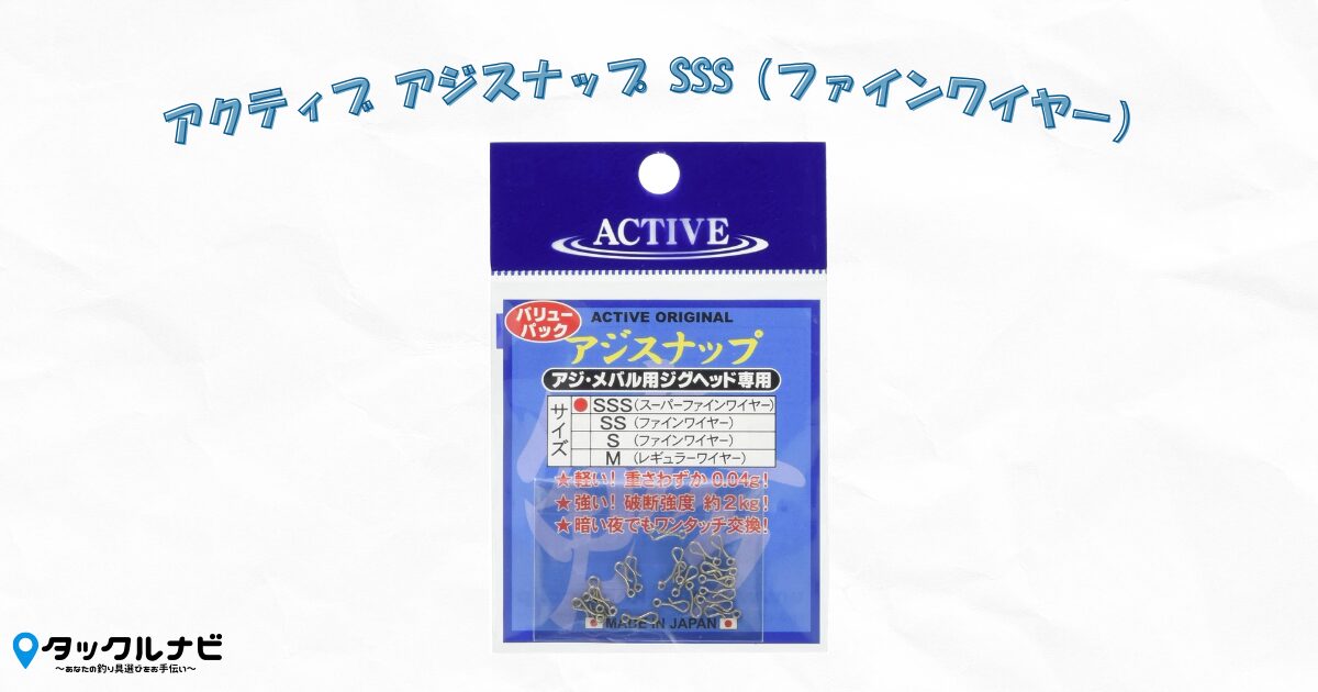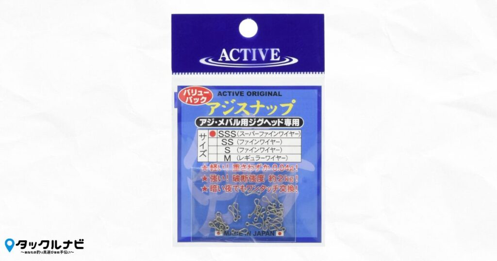 「アクティブ アジスナップ SSS(ファインワイヤー)」は超軽量で、軽いジグヘッドの動きを邪魔しにくいスナップなので、ぜひ商品ページをチェックしてみてください。