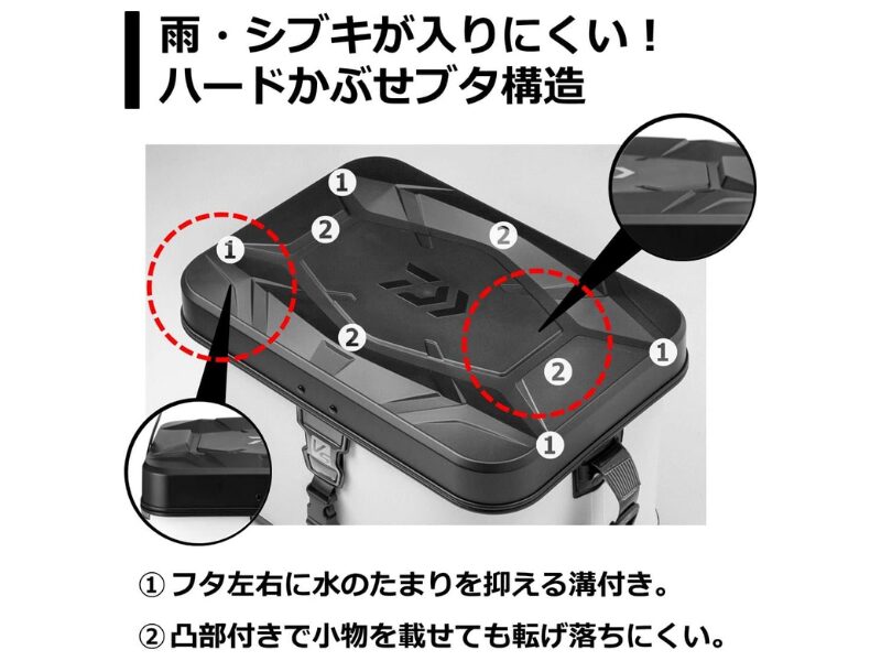 VS タックルバッグH40(A)は一番の特徴は、ふたは硬めのかぶせ式で、水が入りにくいだけでなく、ふたの上に置いた小物が転がり落ちにくいことです。
