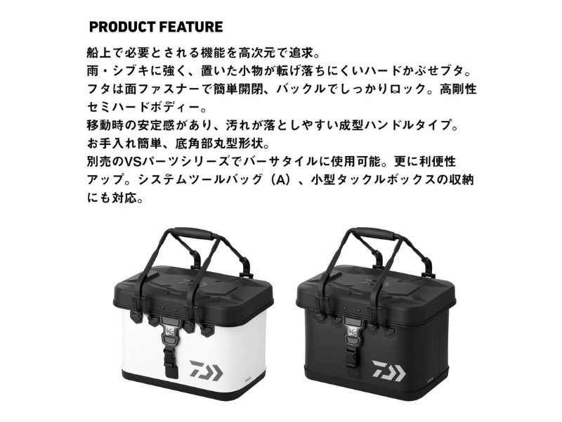 次にご紹介するのは水や汚れに強くて手入れが楽で、ふたまわりの工夫で船上でも小物が散らかりにくい「VS タックルバッグS50(A)」です!