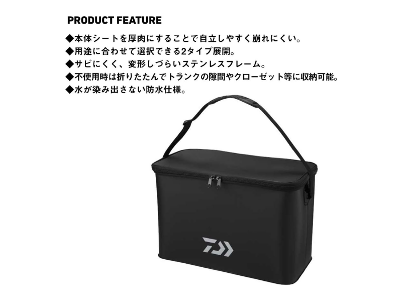 タックルトート F60(K)の一番の特徴は、本体の生地を厚くしているため自立しやすく、道具をまとめて入れてもへたりにくいことです。また、さびにくく変形しづらい骨組みを入れているので、開口部がつぶれにくく、出し入れのたびにイライラしにくい作りです。