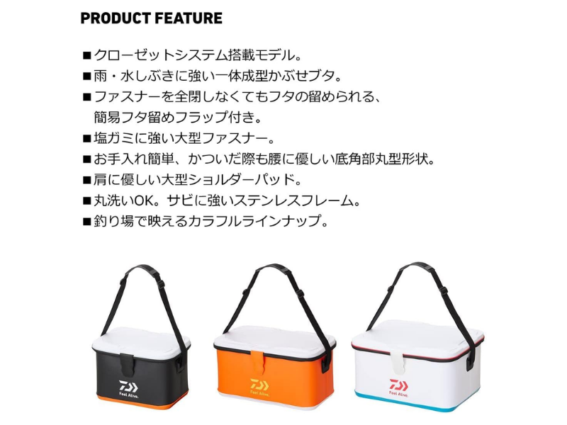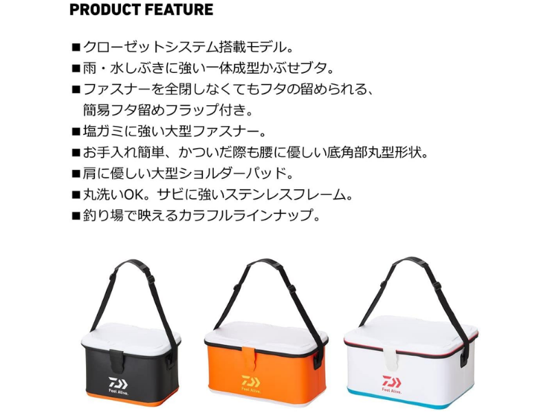 タックルバッグCS32 L (K)BK Oの一番の特徴は、雨や水しぶきが入りにくい一体形のふたを採用しているので、船の上や足場の濡れやすい場所でも安心して使えることです。