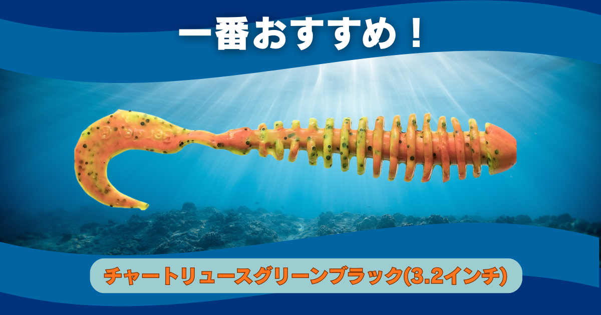 「チャートリュースグリーンブラック(3.2インチ)」は濁り潮でも自然にアピールでき、釣果を必ず上げてくれるカラーなので、ぜひ商品ページをチェックしてみてください。