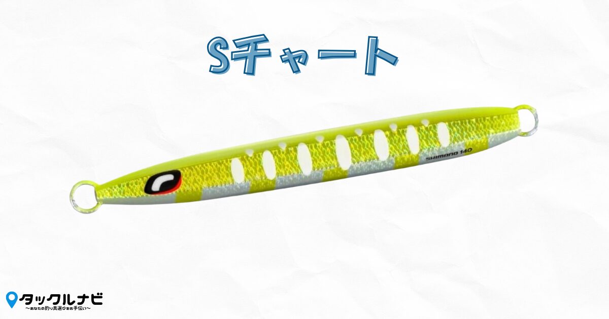 最初にご紹介するのははっきり目立つ色で、濁り気味の水でも魚に気づかれやすい「Sチャート」です!