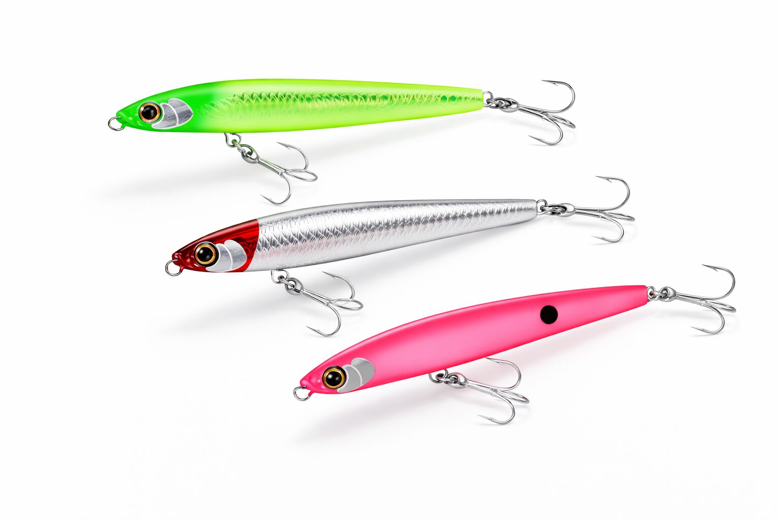 魚の活性が高い時はキラキラと光る「ホログラム系」で広範囲から呼び寄せ、魚が警戒している時は光を抑えた「マット系」でじっくり見せて食わせます。